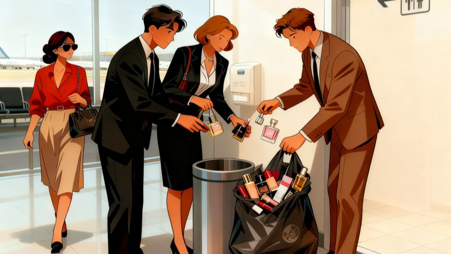 在熙攘的上海机场出发大厅,几位衣着光鲜的旅客刚在免税店完成“扫货”。他们手中的购物袋里装满了崭新高档化妆品,然而接下来的举动却与方才的从容消费形成鲜明对比——在候机区角落,几人神色慌张地将免税品胡乱塞进黑色垃圾袋,用废弃物覆盖后迅速离开。