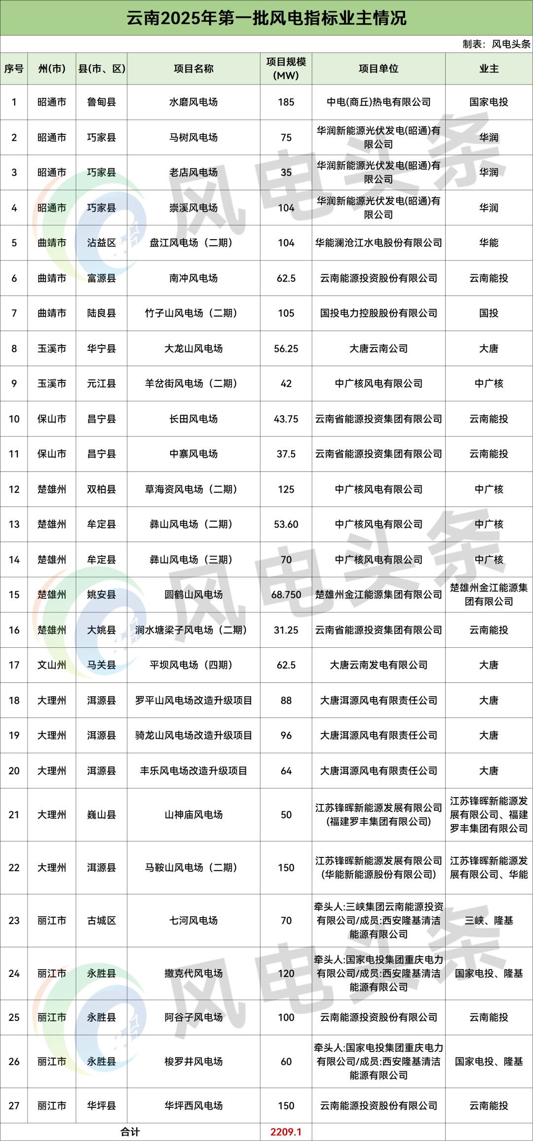 从业主方面来看,中广核、大唐、国家电投、国家能源集团、华能、华润、中国电建、云南能投、运达股份等企业或联合体获得风电指标。
