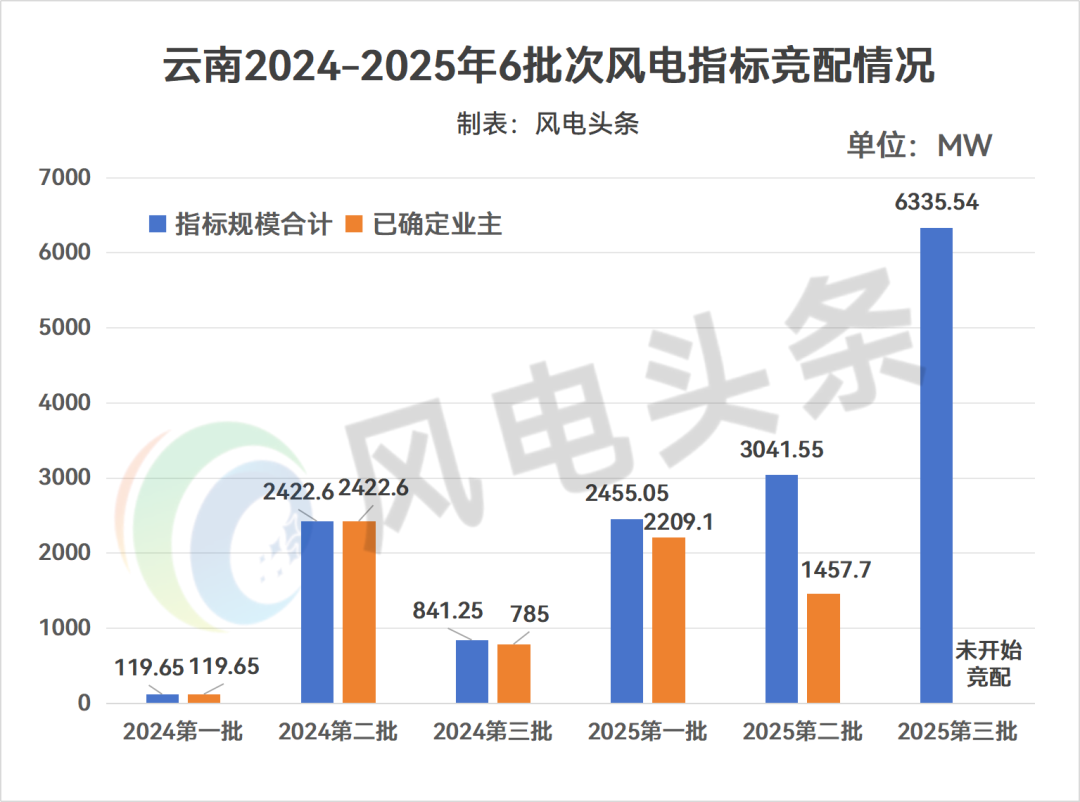 据风电头条梳理,2024-2025年云南累计下发6批次风电指标,规模合计15215.64MW。其中,2024年下发3批,风电规模合计3383.5MW;2025年下发3批,规模合计11832.14MW。