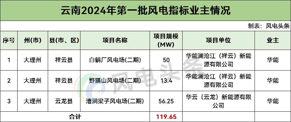 《通知》指出,纳入云南省2024年第一批新能源项目开发建设方案实施的项目共141个,总规模1018.325万千瓦,其中,风电项目3个,规模共计119.65MW。