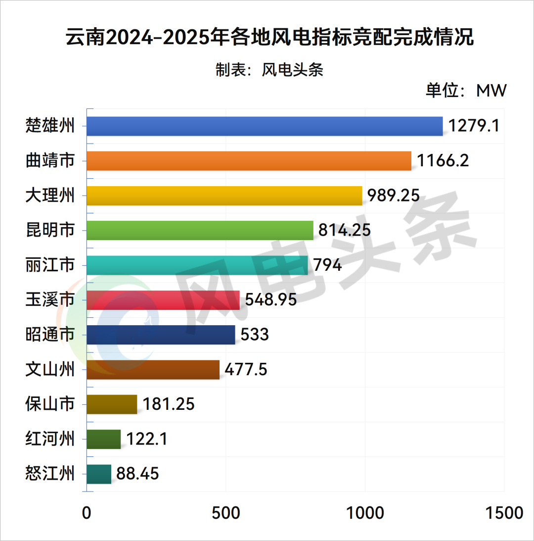 从各市/州风电项目竞配完成情况来看,楚雄州以1279.1MW位列第一,曲靖市以1166.2MW排名第二,大理州以989.25MW位列第三。