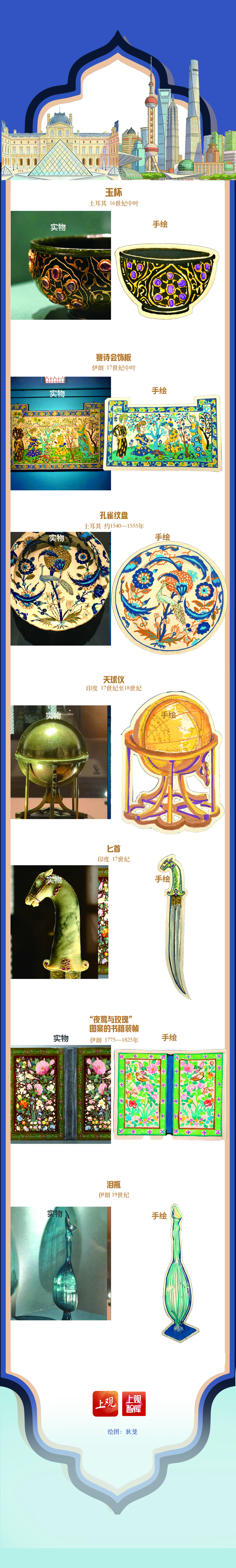 本次展览共计展出约300件卢浮宫馆藏珍品,呈现16至19世纪印度、伊朗和奥斯曼的璀璨艺术世界,涵盖了陶瓷器、珠宝、玉石器物、玻璃制品、金属制品、地毯、书法、绘画、雕塑、木质雕刻物等品类。